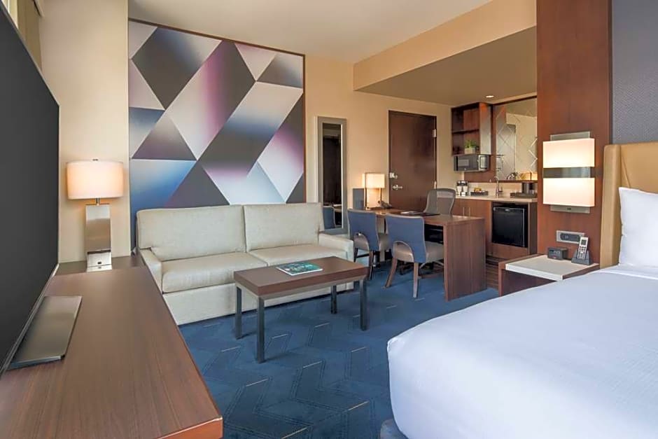 Boasting city views, this hearing accessible suite features a separate living area with a flat-screen TV.